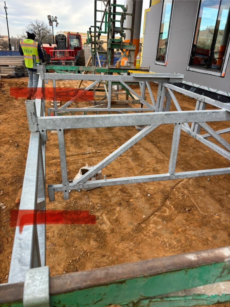 Background: A salesman talked our customer into trying this counterfeit bridge on our scaffold. When it was hard to install, the customer took the picture you see and sent it to us asking for advice on how to install it. Fortunately, we noticed right off that the bridge components would separate and fall when the scaffold was cranked.